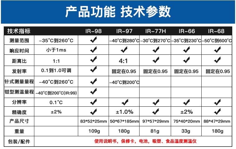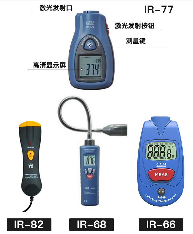 IR-66掌上式紅外測溫儀包括IR-66、IR-66B兩個型號。 CEM出品的IR-66系列掌上式紅外線測溫儀,符合人體工程學(xué)設(shè)計,其體積比手掌還小,方便攜帶,是您工作上各種設(shè)備檢修、溫度情況了解,以及您日常生活起居的多功能測溫儀佳選擇。 IR-66掌上式紅外線測溫儀特性: 1.*的非接觸式測量 2.獨特新穎的外觀設(shè)計 3.自動關(guān)機(jī)及自動記錄數(shù)據(jù) 4.℃/℉ 轉(zhuǎn)換裝置 5.自動量程選擇及大小值記錄 6.小巧的尺寸設(shè)計使測量方便又便于攜帶 7.大的液晶顯示屏 8.上鎖功能及低電量提示