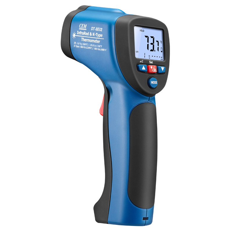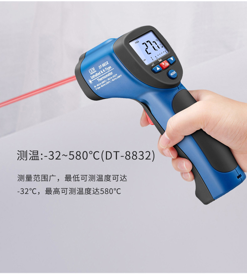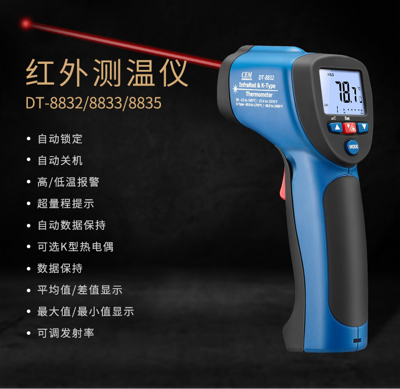 華盛昌DT-8832二合一紅外線測(cè)溫儀屬于紅外測(cè)溫儀,鋌和華盛昌CEM品牌專(zhuān)區(qū)提供詳細(xì)的華盛昌DT-8832二合一紅外線測(cè)溫儀介紹,包括華盛昌DT-8832二合一紅外線測(cè)溫儀價(jià)格、基本參數(shù)、產(chǎn)品特點(diǎn)、華盛昌DT-8832二合一紅外線測(cè)溫儀圖片、功能及適用范圍等信息,還有華盛昌DT-8832二合一紅外線測(cè)溫儀問(wèn)答及用戶評(píng)價(jià)為您選購(gòu)提供全方位的參考。想了解更多更全的華盛昌CEM紅外測(cè)溫儀報(bào)價(jià)、型號(hào)、種類(lèi)以及使用方法相關(guān)內(nèi)容,可以到華盛昌CEM品牌專(zhuān)區(qū)。 華盛昌DT-8832二合一紅外線測(cè)溫儀是紅外測(cè)溫和K型溫度測(cè)溫結(jié)合的二合一紅外線測(cè)溫儀 雙注塑機(jī)殼、1米防摔,高達(dá)30:1的距離比 帶K型熱點(diǎn)偶測(cè)溫,可以根據(jù)您的需要適應(yīng)不同場(chǎng)合的測(cè)溫要求。 溫度段從380℃至1050℃滿足測(cè)溫場(chǎng)景 ℃/℉溫度單位轉(zhuǎn)換 可達(dá)±1.5%測(cè)量精度 自動(dòng)數(shù)據(jù)保持 20個(gè)數(shù)據(jù)儲(chǔ)存 最大值/最小值顯示 K型熱電偶測(cè)溫(量程設(shè)計(jì)-50℃至1370℃) 超亮背光LCD顯示,在暗處也可以輕易測(cè)量和讀數(shù) 自動(dòng)獲取目標(biāo)的可調(diào)發(fā)射率,可測(cè)量不同材質(zhì)的物體表面溫度 距離比D:S=16:1,30:1供選擇,高距離比可遠(yuǎn)距離測(cè)量更小尺寸目標(biāo)