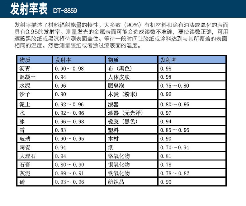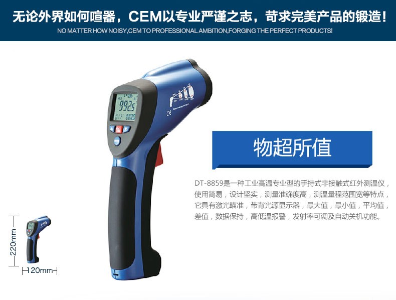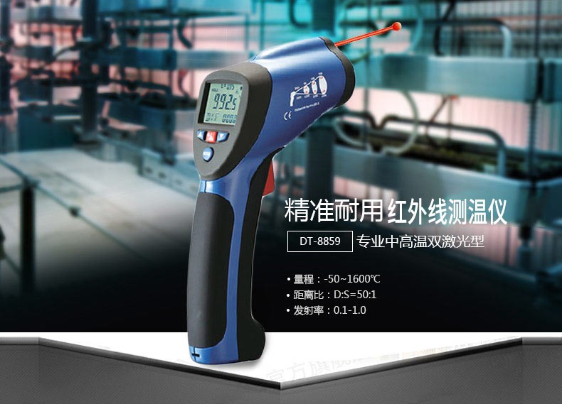 DT-8829紅外線測(cè)溫儀一種專業(yè)型的手持式非接觸紅外線測(cè)溫儀,使用簡(jiǎn)易,設(shè)計(jì)堅(jiān)實(shí),測(cè)量準(zhǔn)確度高,測(cè)溫量程范圍寬等特點(diǎn)。它具有激光瞄準(zhǔn),帶背光源顯示器,最大值,最小值,平均值,差值,數(shù)據(jù)保持,高低溫報(bào)警,發(fā)射率可調(diào)及自動(dòng)關(guān)機(jī)功能。該手持式非接觸紅外線測(cè)溫儀可用于測(cè)量那些不適合使用傳統(tǒng)接觸式測(cè)量方法來(lái)測(cè)量物體的表面溫度(例如移動(dòng)物體,帶電表面和難以接觸到的物體)。特征:非接觸式精確測(cè)溫高的光學(xué)測(cè)量距離與物體目標(biāo)比(D:S-16;1/50:1)測(cè)溫量程范圍寬獨(dú)特新式的機(jī)殼設(shè)計(jì)內(nèi)置激光瞄準(zhǔn)器自動(dòng)數(shù)值保持℃/F轉(zhuǎn)換按鍵發(fā)射率調(diào)整從0.10 到1.0,(8829固定在0.95)MAX,MIN,DIF,AVG 溫度顯示帶背光源LCD顯示屏自動(dòng)選擇量程,分辨率為0.1