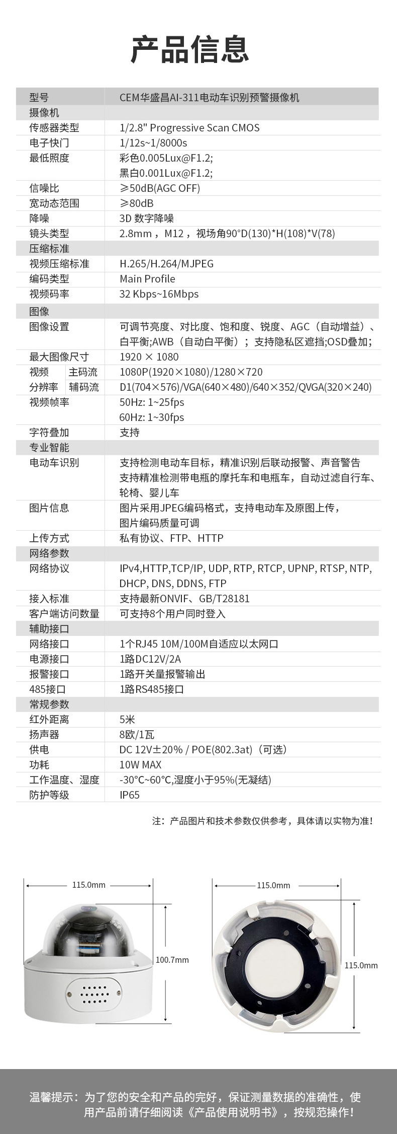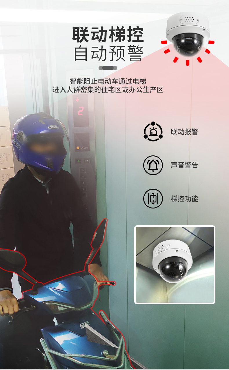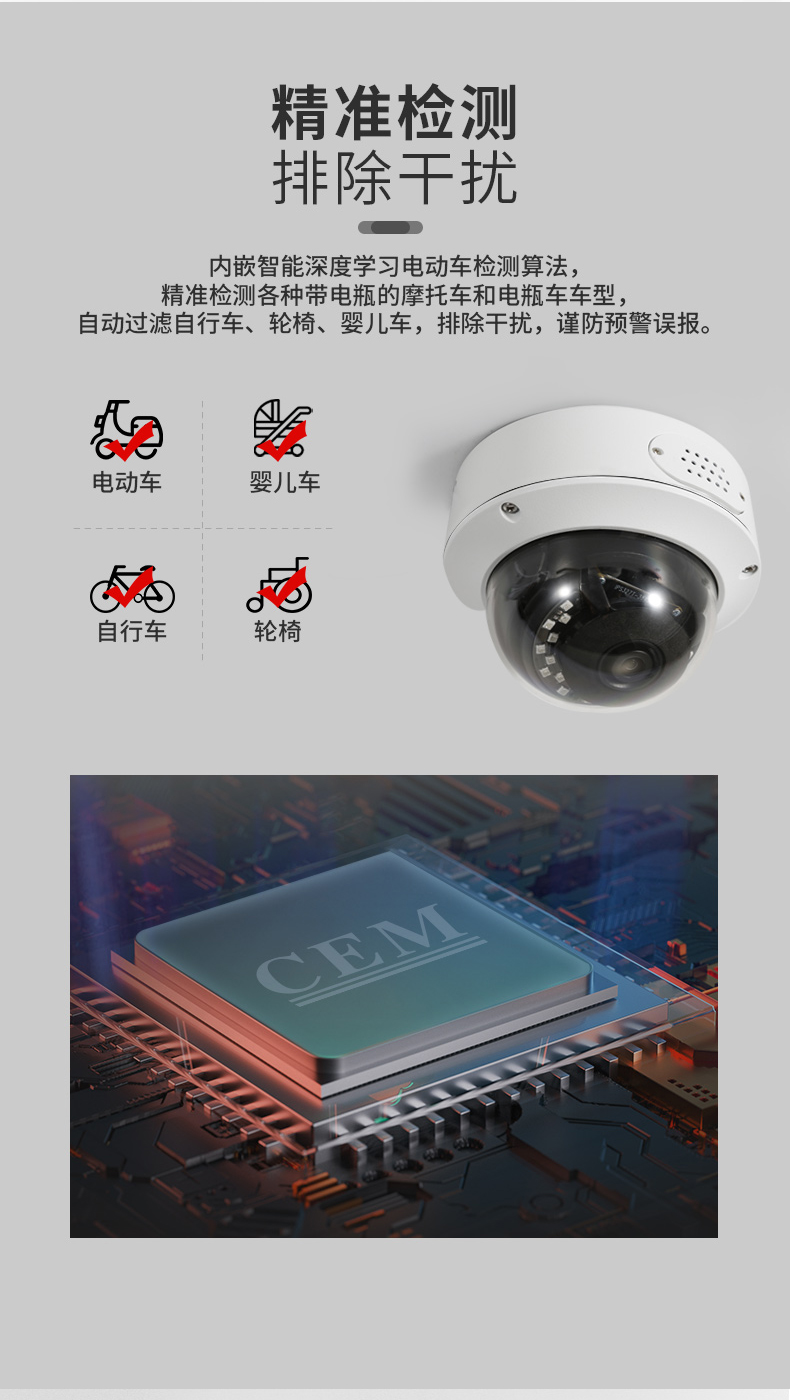 電動(dòng)車識(shí)別預(yù)警攝像機(jī):電動(dòng)車識(shí)別預(yù)警攝像機(jī)設(shè)備嵌入電動(dòng)車識(shí)別算法,實(shí)現(xiàn)對電動(dòng)車檢測分析識(shí)別,實(shí)時(shí)預(yù)警周界區(qū)域內(nèi)電動(dòng)車闖入事件,前端攝像機(jī)一體化完成分析、識(shí)別、預(yù)警,并上傳平臺(tái)。