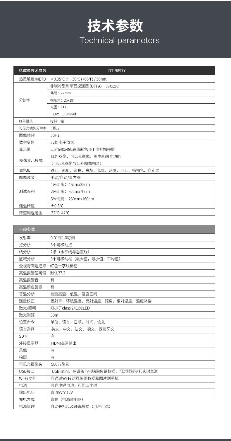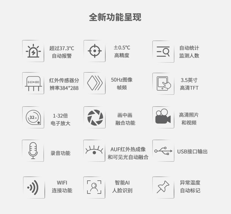 分辨率:384*288、圖像幀頻:50HZ、篩查測溫范圍:32-42℃、HDMI輸出大屏全屏顯示、AI人臉識別、自動統(tǒng)計監(jiān)測人數(shù)、可同時完成多人測溫。