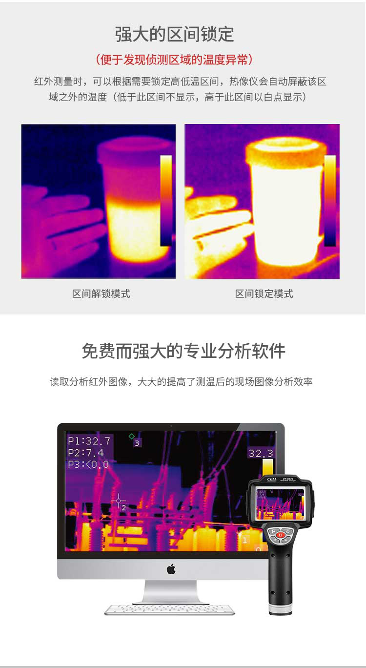 標配鏡頭7.5mm,分辨率160×120,IFOV:3.33mard,視場角29.8×22.6°,熱靈敏度NETD<0.08℃,圖像幀頻50Hz,溫度范圍(-20-800),可見光分辨率640×480像素